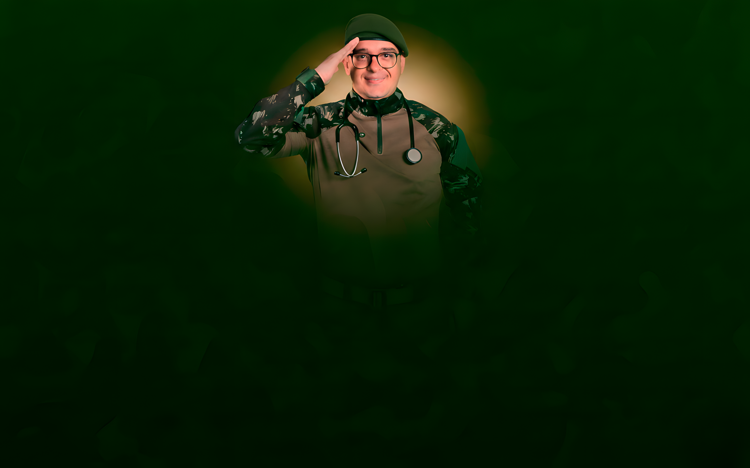 O Exército oferece especialização nos seus próprios hospitais de elite. Você estuda recebendo soldo integral + bolsa de residência. As vagas são distribuídas por especialidades de interesse da Força e selecionadas via processo interno meritocrático.